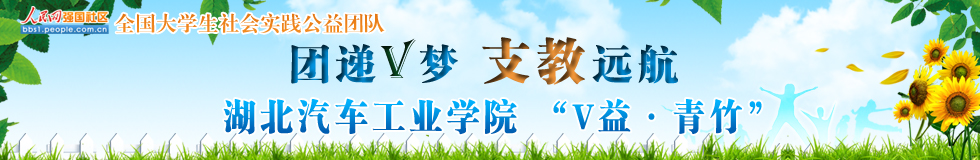“V益·青竹”支教團隊由9名本科生組成。他們利用兩周暑假時間到湖北省竹溪縣蔣家堰鎮中原小學,開展以“團遞V夢 支教遠航”的主題的實踐活動。自7月9日開始,從“一米陽光暖庸巴”主題愛心募捐和義賣、“支教路上共成長”主題支教、“我的V夢想”主題畫展暨文藝匯演、和“團遞V夢 支教遠航”主題宣講等四個方面開展實踐活動。團隊已經在六堰廣場舉行了“一米陽光暖庸巴”報紙義賣和愛心募捐活動,將籌集到的善款和物資捐贈給中原小學。支教課堂上,志愿者們教授孩子們英語、華爾茲、電子琴、繪畫等課程,開設班級也由計劃中的一個班擴展到三個班。