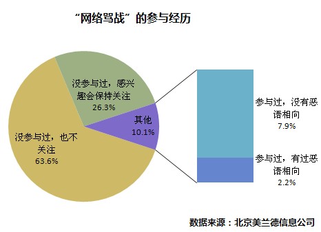 社交媒體的勃興為網民提供了便捷的交流平臺,但網絡的開放性、隱蔽性、無約束性、虛擬性卻容易使平和的討論演變為幾個意見各異“陣營”之間的“對決”,方舟子質疑韓寒、馮小剛怒罵孫海英等事件中,當事人及其背后的粉絲團一度在微博上針鋒相對;但是,有多少網民真正關注乃至參與到網絡罵戰中?本次調查發現,六成民眾對網絡罵戰“不參與也不關注”,26.3%的人會持續關注自己感興趣的網絡爭論,僅有一成表示參與過網絡罵戰,這其中,只有極少數(2.2%)承認自己在罵戰中曾對他人惡語相向。