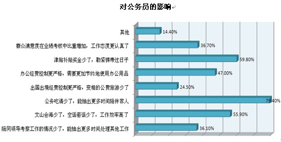 還有三到五成受訪公務員認為“辦公經費控制更嚴格,需要更加節約地使用辦公用品”、“群眾滿意度在業績考核中比重增加,工作態度更認真了”和“陪同領導考察工作的情況少了,能抽出更多時間處理其他工作”是“八項規定”帶來的幾大影響。