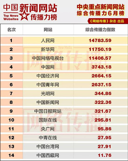 近日,中央網信辦《網絡傳播》雜志推出2015年6月“中國新聞網站傳播力榜”,人民網排名位居14家中央重點新聞網站首位。新華網、中國網絡電視臺分列第二、第三名。