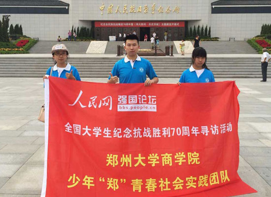 7月16日,鄭州大學“少年鄭青春”暑期實踐隊,開展了“緬懷革命先烈,樹立信心實現中國夢”實踐活動。團隊通過抗戰知識調研、參觀抗戰紀念館、采訪抗戰老兵、向幼兒園孩子普及抗戰知識等方式紀念抗戰勝利70周年。