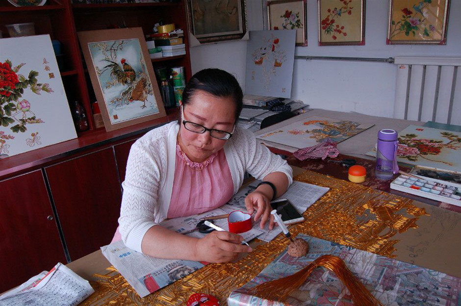 “因為喜歡”,簡簡單單四個字,卻有著震撼人心的力量,蘭州理工大學“問藝社”的同學們走進古香古色的工作室,見到了掐絲畫藝人高芬平。她曾擁有穩(wěn)定的教師工作,只因?qū)ζz畫的無限喜愛而辭職走上了艱難辛苦的從藝之路。如今的她是一位掐絲畫高級工藝師,正在制作靜寧特色掐絲畫——絲綢之路,巨幅畫作幾乎和她一樣高。在明媚陽光的工作室里,她享受著自己忙碌中的寧靜。