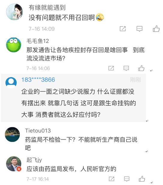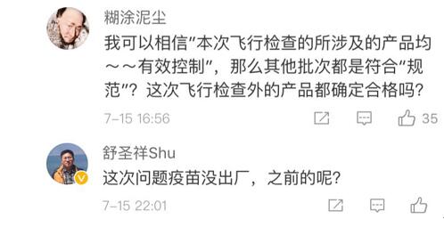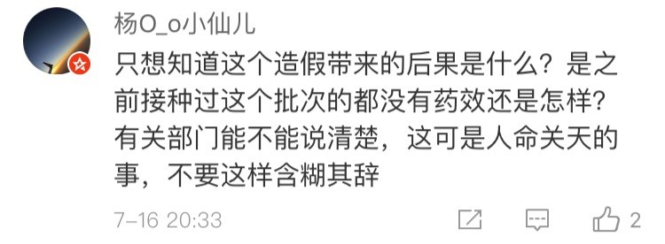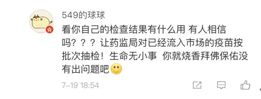 網(wǎng)友“楊O_o小仙兒”表示:“只想知道這個造假帶來的后果是什么?是之前接種過這個批次的都沒有藥效還是怎樣?有關(guān)部門能不能說清楚,這可是人命關(guān)天的事,不要這樣含糊其辭。”