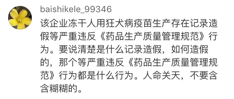 網(wǎng)友“baishikele_99346”認(rèn)為:“要說清楚是什么記錄造假,如何造假的,那個等嚴(yán)重違反《藥品生產(chǎn)質(zhì)量管理規(guī)范》行為的都是什么行為。人命關(guān)天,不要含含糊糊。”