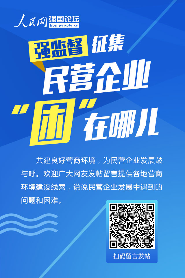 共建良好營商環(huán)境,為民營企業(yè)發(fā)展鼓與呼,人民網(wǎng)強(qiáng)國論壇開設(shè)“專項(xiàng)監(jiān)督”版塊,歡迎廣大網(wǎng)友發(fā)帖留言提供各地營商環(huán)境建設(shè)線索,說說民營企業(yè)發(fā)展中遇到的問題和困難,以期共同推動(dòng)“糾正一些政府部門、大企業(yè)利用優(yōu)勢地位以大欺小、拖欠民營企業(yè)款項(xiàng)的行為”,為民營經(jīng)濟(jì)發(fā)展創(chuàng)造健康環(huán)境。