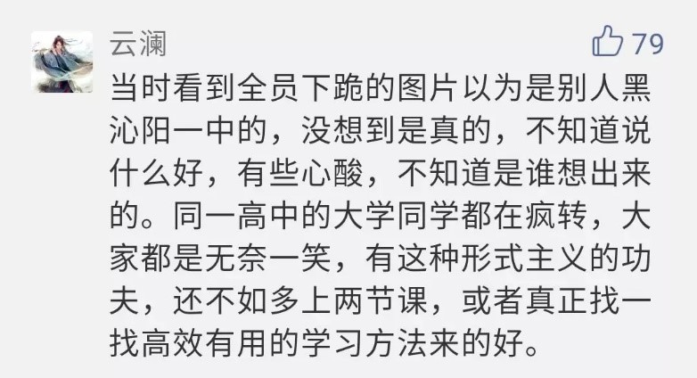 視頻發(fā)布后引發(fā)了網(wǎng)友討論。有人質(zhì)疑此活動(dòng)過于“形式主義”,遭學(xué)校官號(hào)怒懟:思維是不是有毛病?11月21日,該所學(xué)校回應(yīng)稱,校領(lǐng)導(dǎo)在活動(dòng)前不知情,是高三年級(jí)安排的,下跪只是一種形式,想教孩子們學(xué)會(huì)感恩。
