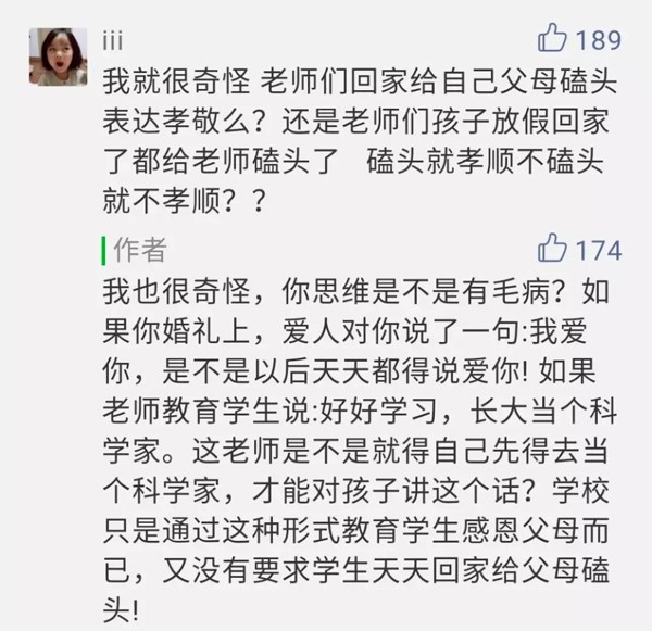 網(wǎng)友“兩點(diǎn)半加雞蛋小王子”:下跪磕頭代表的意義是服從,就是要求孩子乖乖聽話,不可忤逆,暗示孩子你們只是父母的一件所有物,抹殺了獨(dú)立人格的存在。