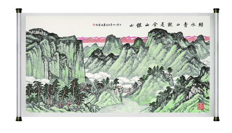 黨的十九大報告指出,人與自然是生命共同體。綠水青山就是金山銀山不僅是一種理念,更要把它變成實踐,成為推進中國生態文明建設的指導思想,推動形成人與自然和諧發展的現代化建設新格局。該系列發于此意。此畫為人民網邀著名畫家創作,素雅大氣,意蘊橫生。
