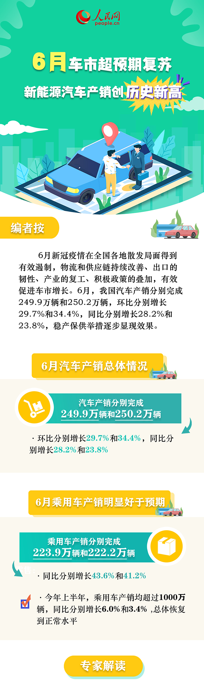 隨著全面復工復產,物流和供應鏈持續改善、促汽車消費政策發力等綜合因素下,6月車市回暖的表現愈發顯著。據中國汽車工業協會數據顯示,6月,我國汽車產銷分別完成249.9萬輛和250.2萬輛,環比分別增長29.7%和34.4%,同比分別增長28.2%和23.8%。