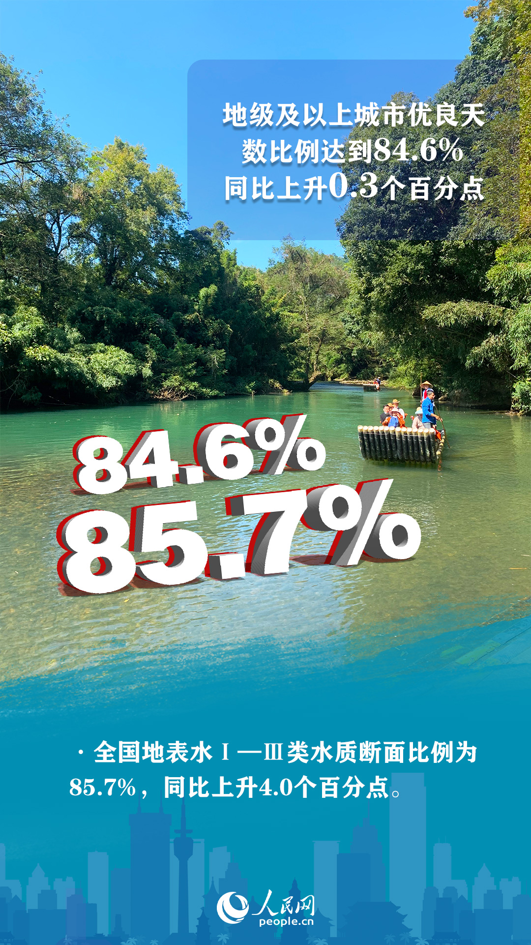 推進重大工程實施。繼續加快實施“十四五”規劃102項重大工程中大氣、水、土壤、固體廢物污染防治和核與輻射安全監管等生態環境領域重大工程項目。今年上半年,全國生態環境質量持續改善。其中,地級及以上城市優良天數比例達到84.6%,同比上升0.3個百分點。全國地表水Ⅰ—Ⅲ類水質斷面比例為85.7%,同比上升4.0個百分點。
