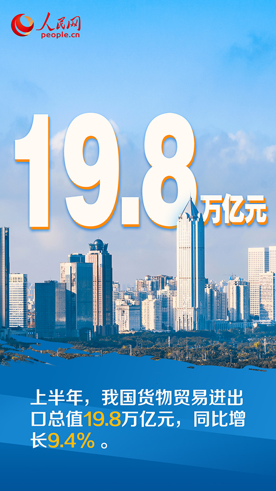 據海關統計,今年上半年我國貨物貿易進出口總值19.8萬億元,同比增長9.4%。其中,出口11.14萬億元,增長13.2%;進口8.66萬億元,增長4.8%……上半年外貿進出口“答卷”傳遞出我國經濟持續恢復的積極信號。