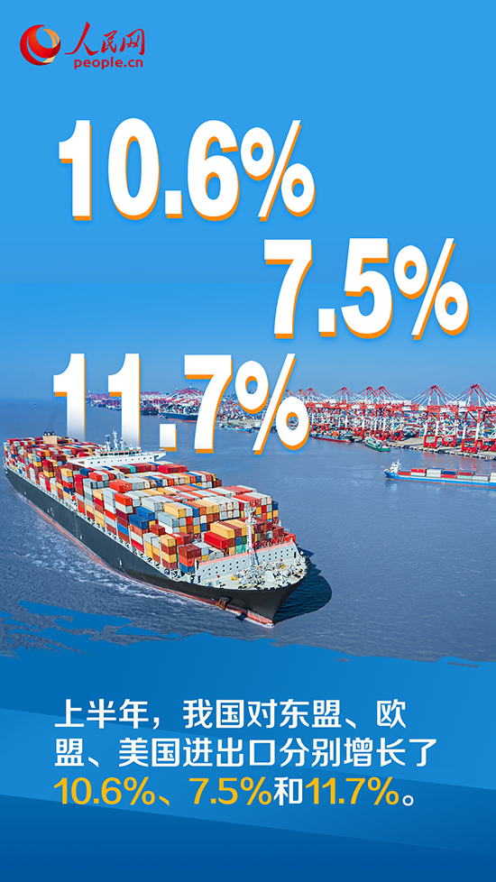 上半年,我國對東盟、歐盟、美國進出口分別增長了10.6%、7.5%和11.7%。同期,我國對“一帶一路”沿線國家、區域全面經濟伙伴關系協定(RCEP)貿易伙伴進出口分別增長17.8%和5.6%。